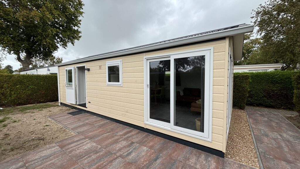 Het chalet wordt half verdiept geplaatst, dat staat mooi en met een kleine verhoging of aan aanpassing aan de tuin kom je makkelijk het chalet in. De verkoopprijs is een optelsom van het chalet, plaatsen, aansluiten, het afwerken van de onderzijde en een stelpost van de tuinaanleg. Een tuinhuis is niet bij de prijs inbegrepen maar kun je naar eigen wens (laten) plaatsen.