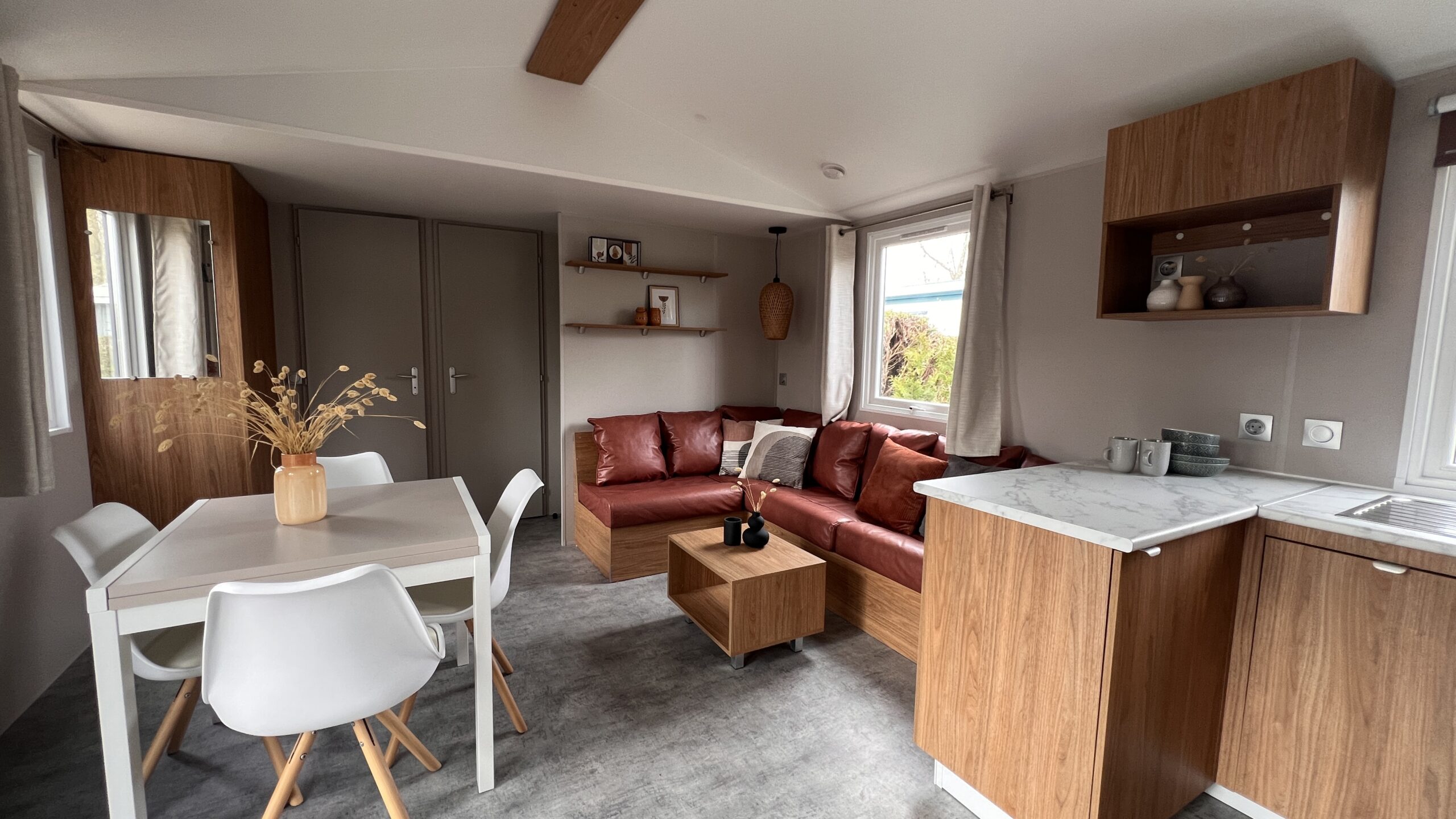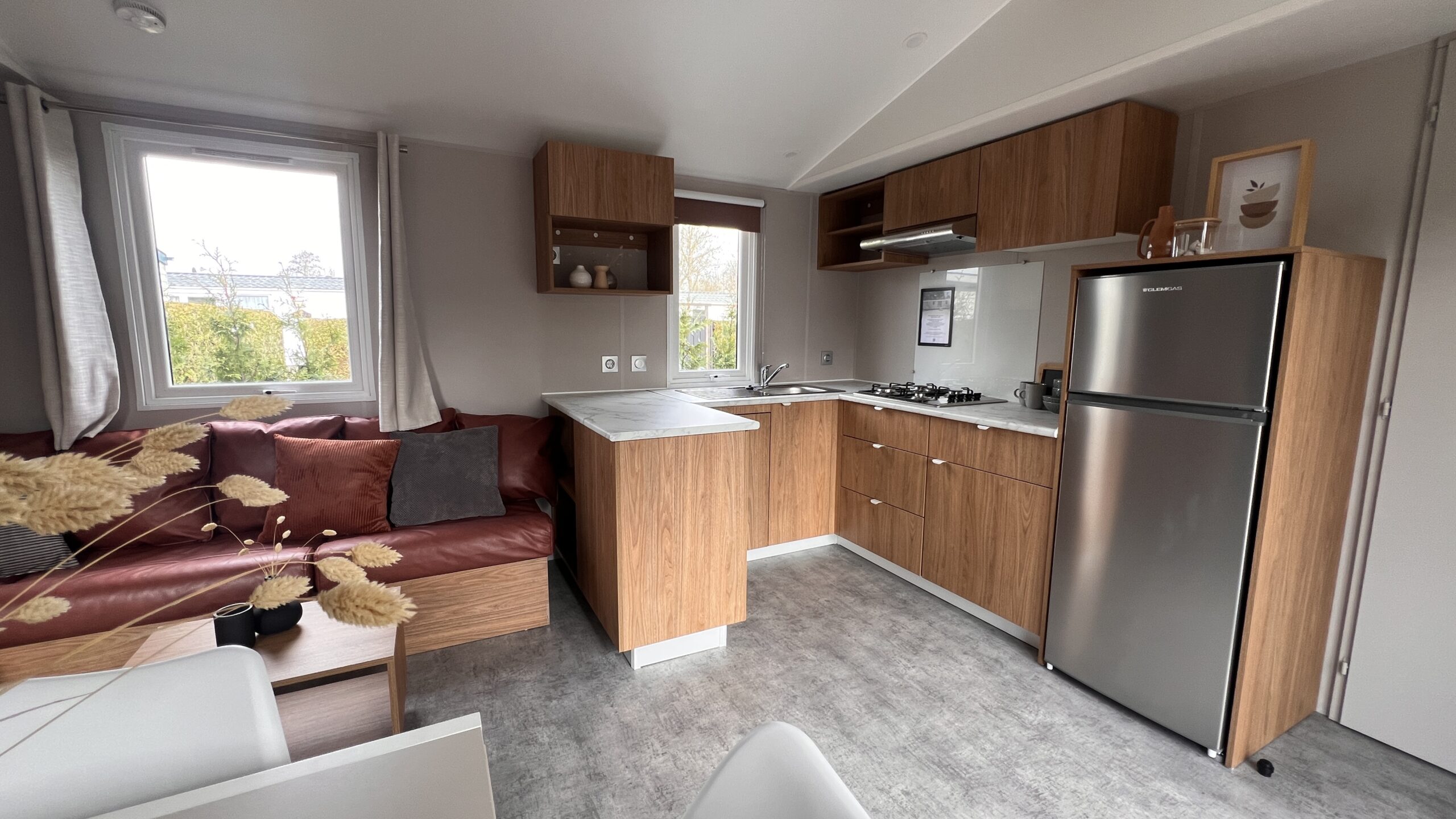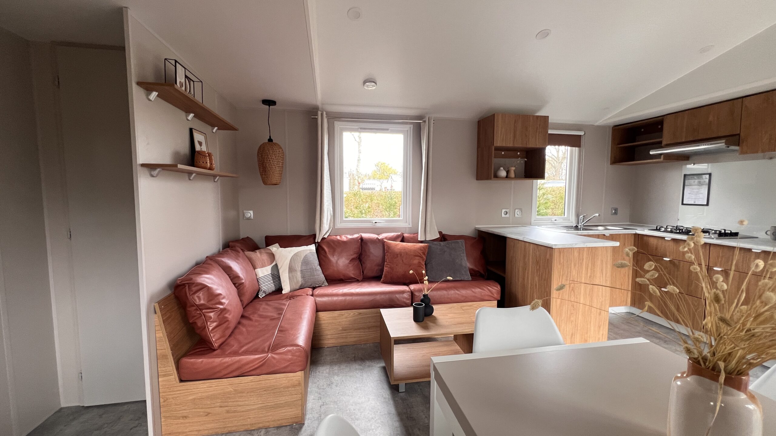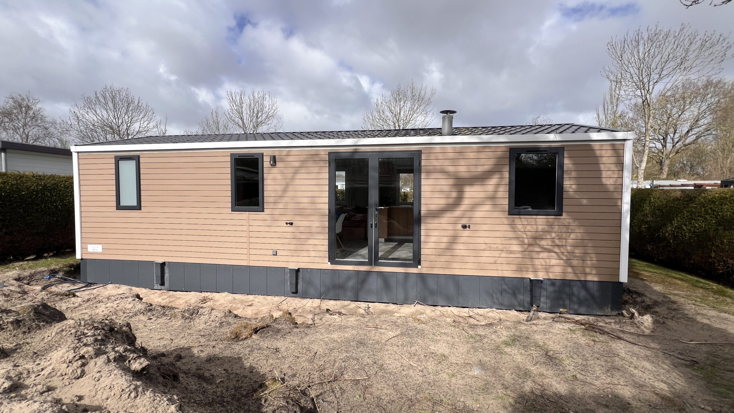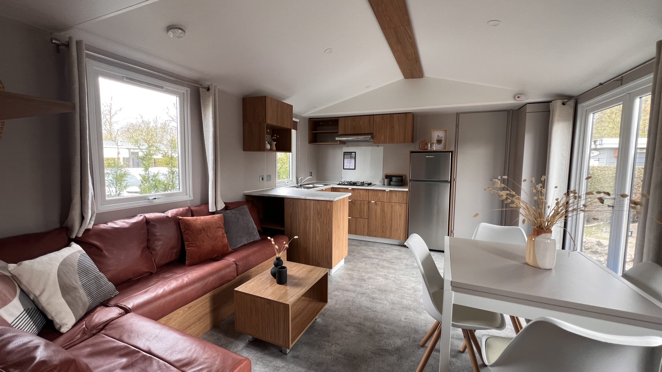 Deze Franse stacaravan met kunststof gevelbekleding in de warme muscade, zorgt voor een frisse en tijdloze uitstraling. Dankzij de goede isolatie is de stacaravan geschikt voor gebruik in meerdere seizoenen.