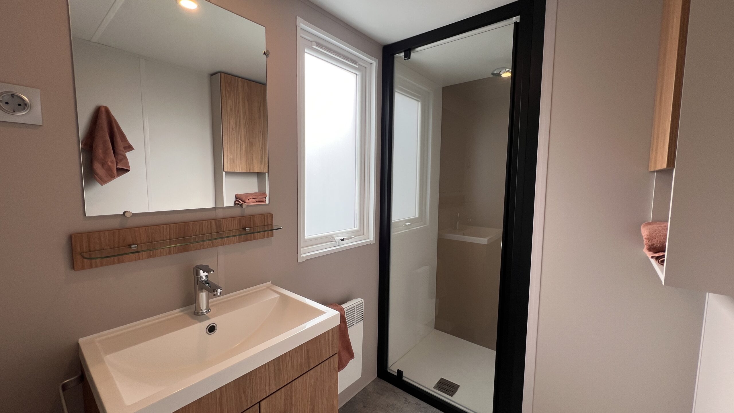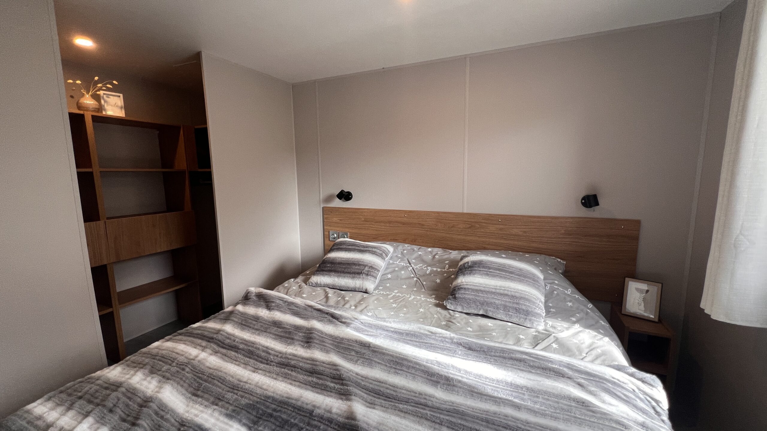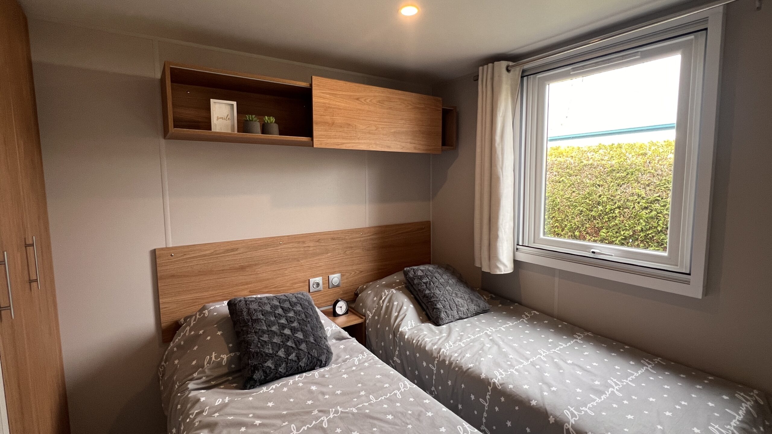 De stacaravan beschikt over twee slaapkamers met kledingkasten en een moderne badkamer met douche en wastafel. Er is een apart toilet.