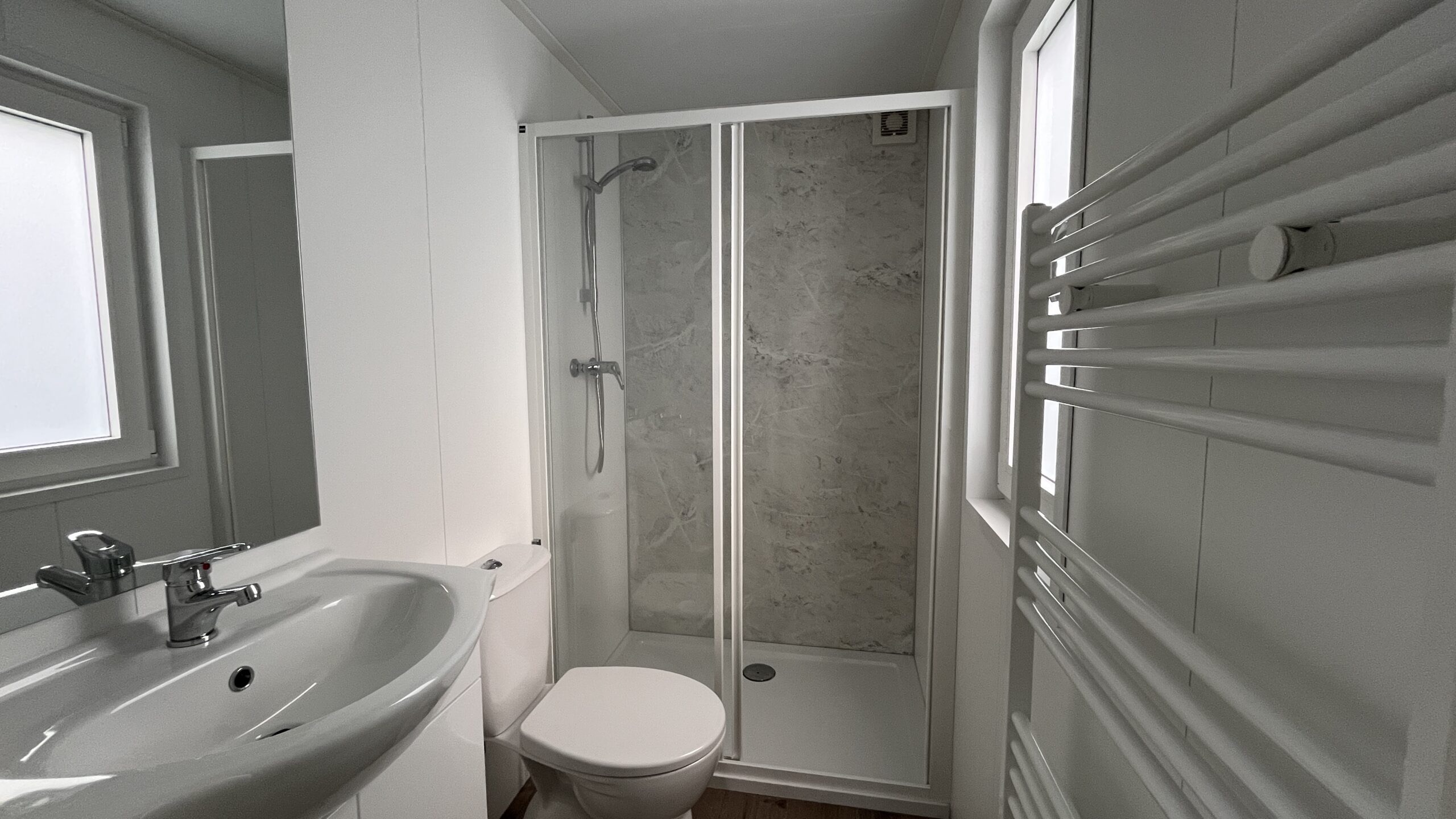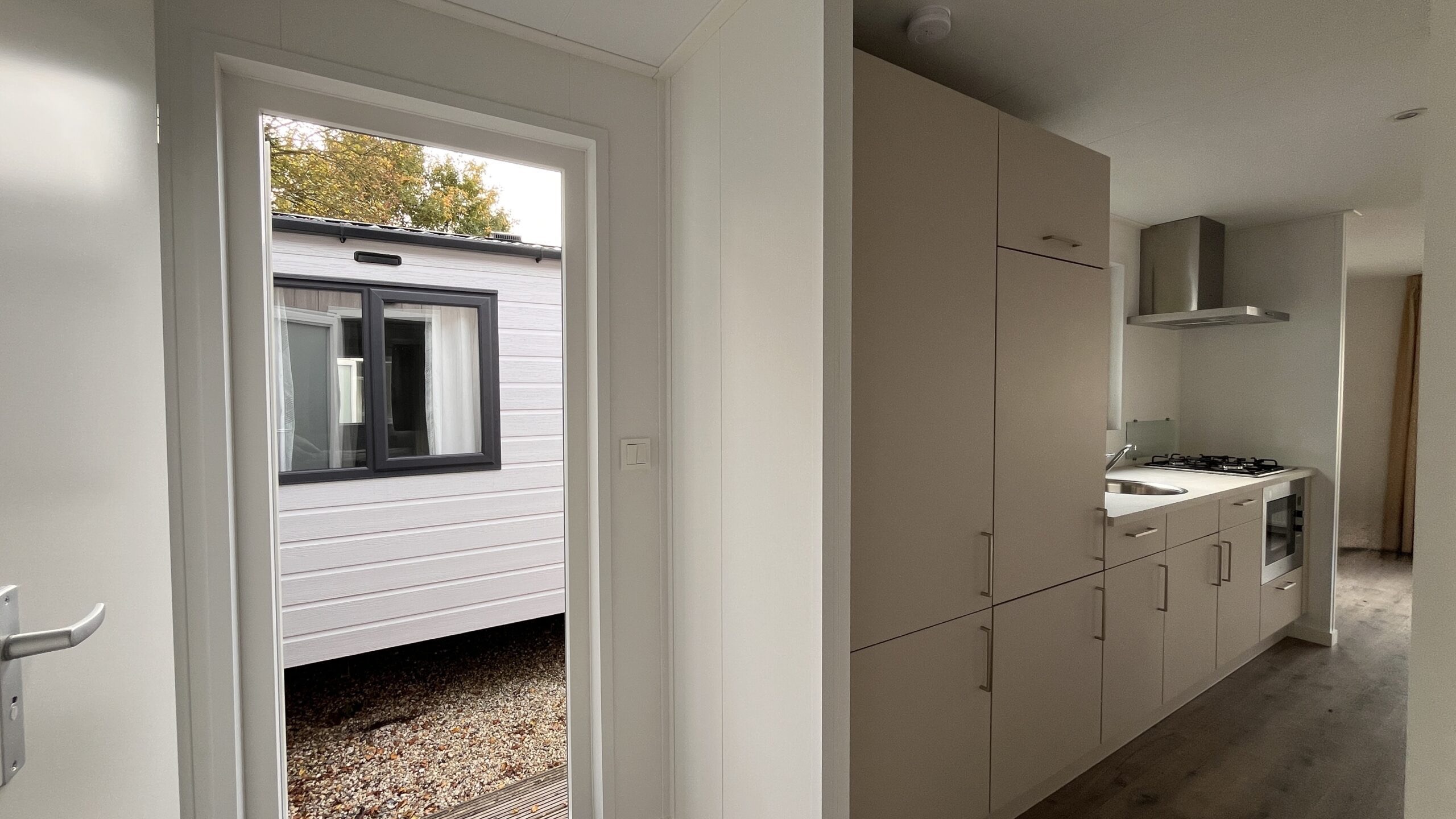 In het chalet een stoere keuken met gasfornuis, afzuigkap en inbouw koel-vriescombinatie. Verder een ruime woonkamer, twee slaapkamers met goede bedden en een badkamer met douche, toilet en wastafel. Vanuit de kamer kun je via de openslaande deuren naar de tuin. Kortom: een prima indeling in mooie moderne kleuren.