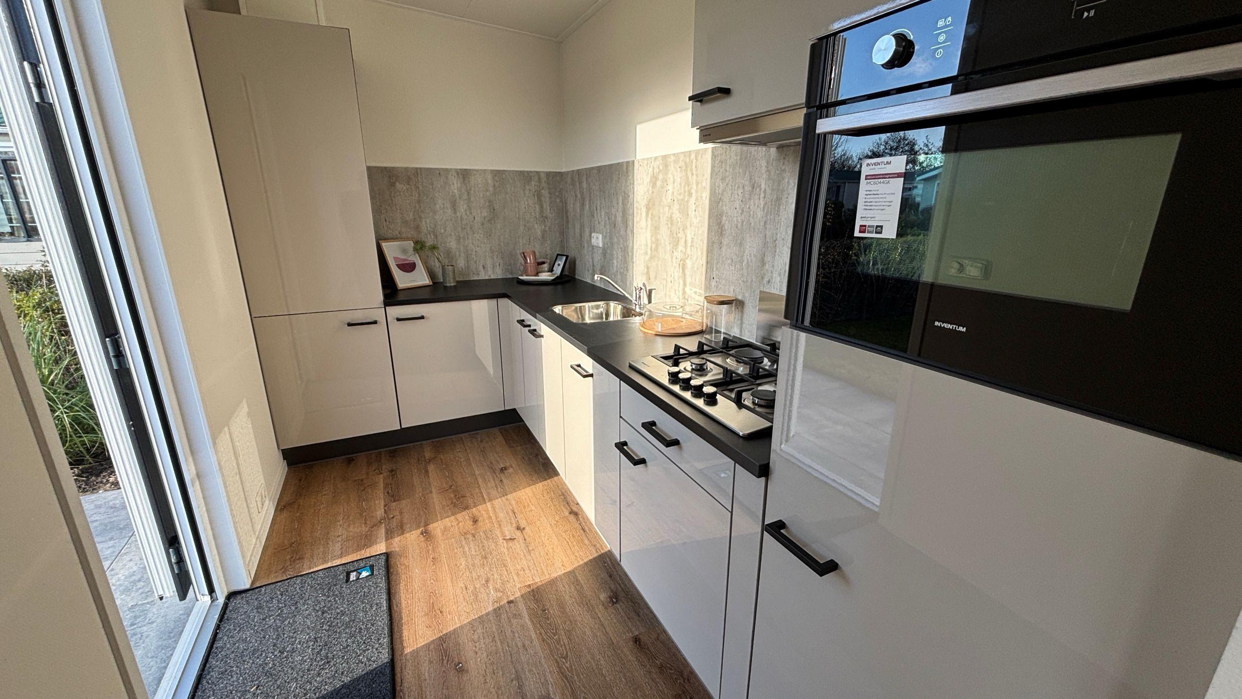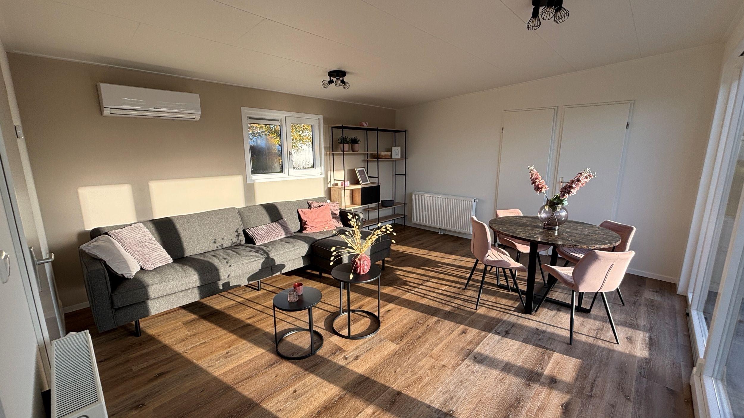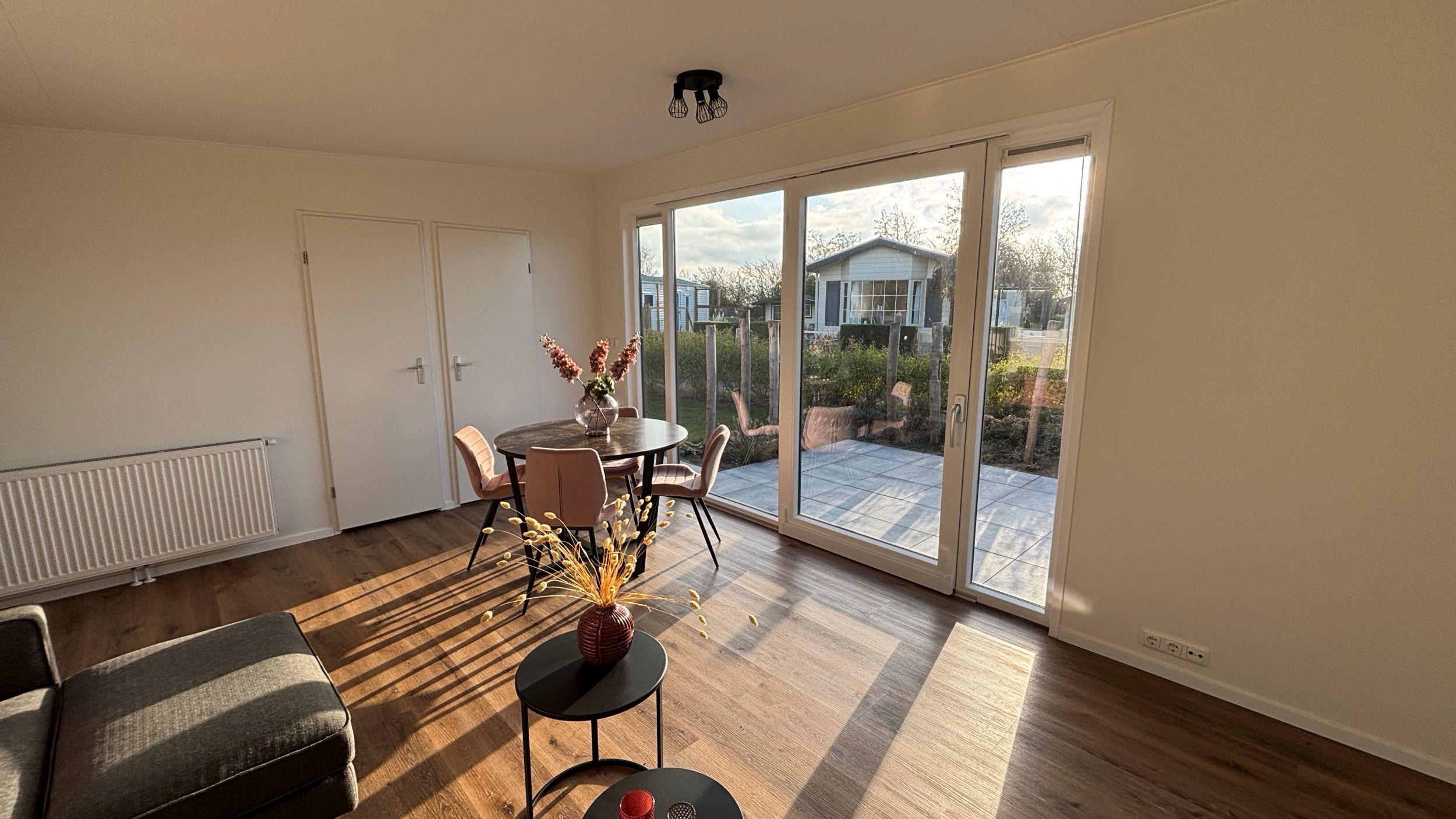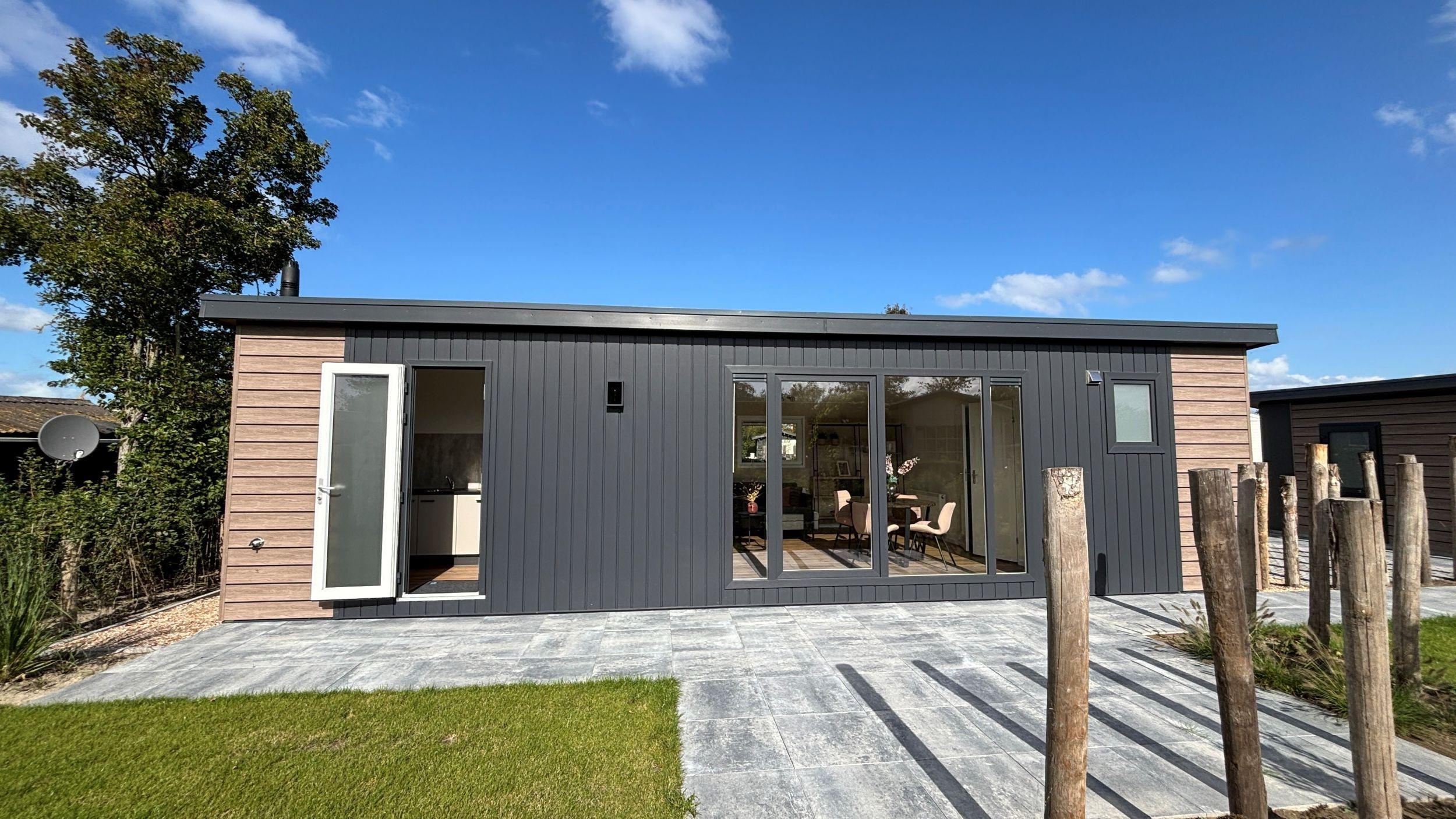 Het chalet zelf is een echte blikvanger met zijn moderne lessenaarsdak en een slimme middenkamer indeling die direct bij binnenkomst verrast. Het hoge plafond zorgt voor een extra ruimtelijk, licht en luxe gevoel.