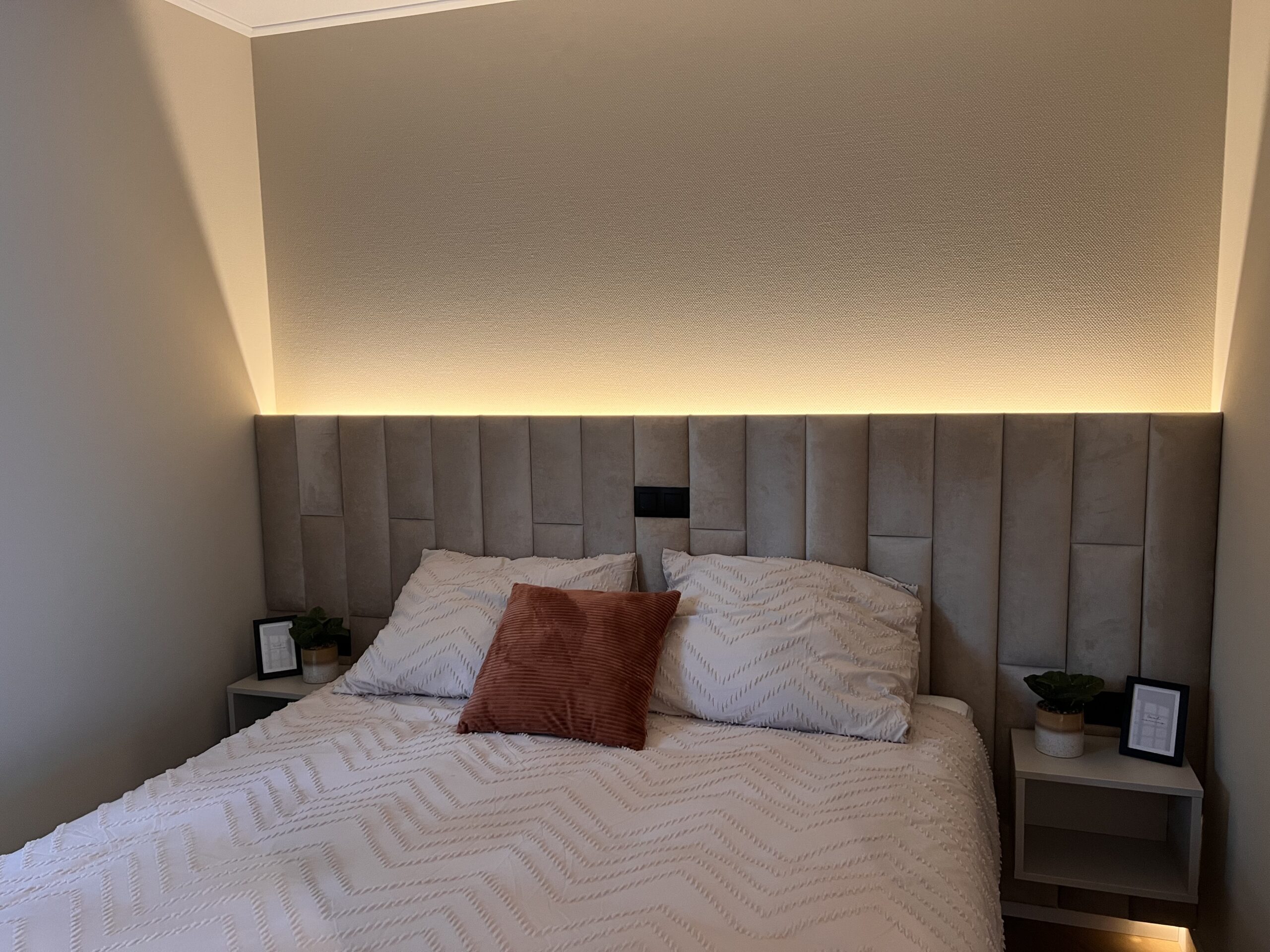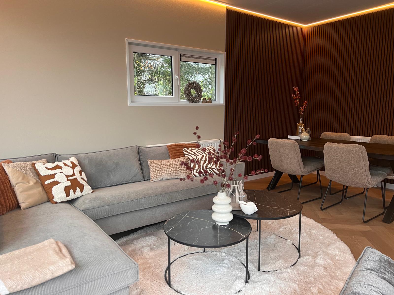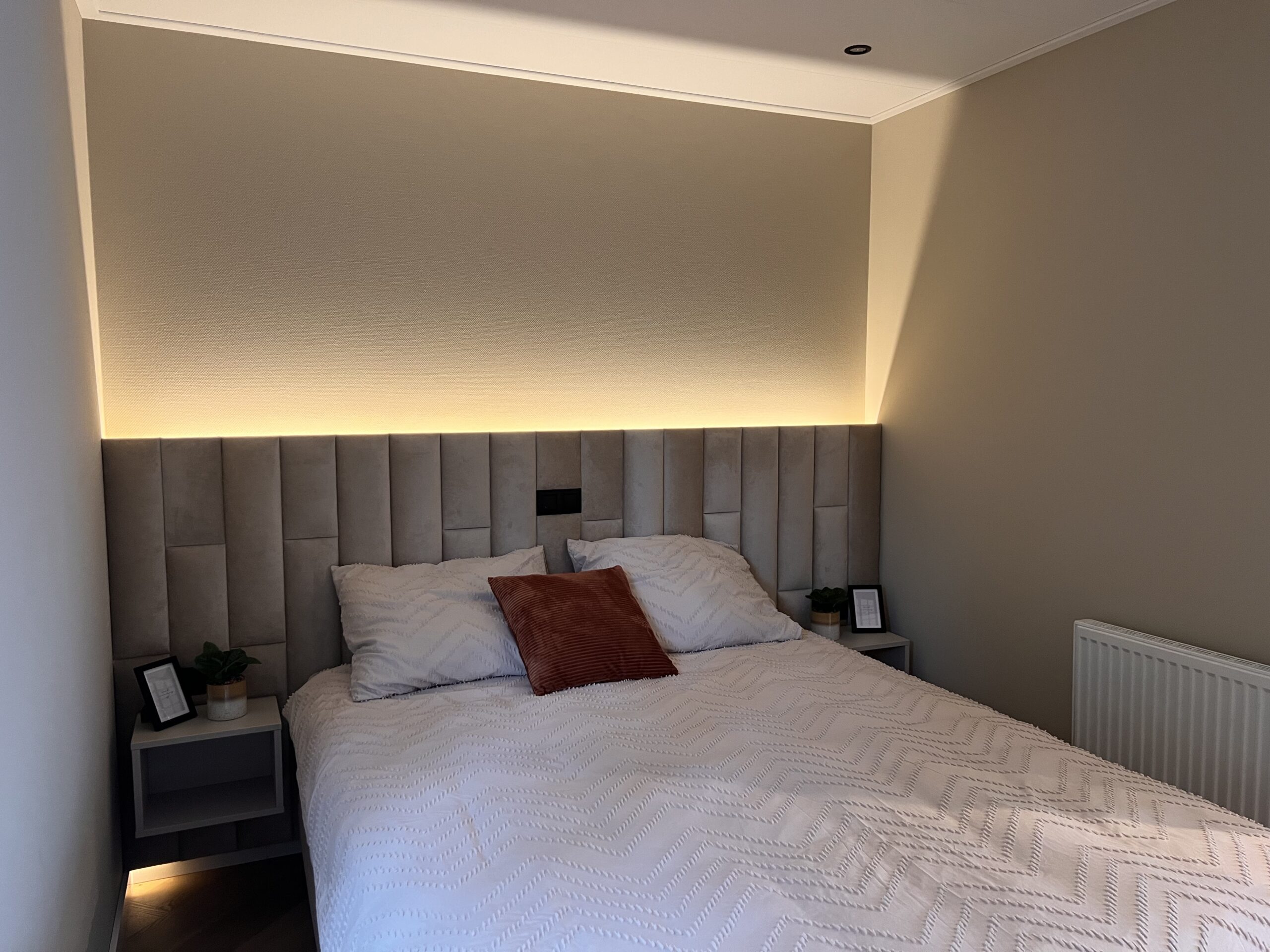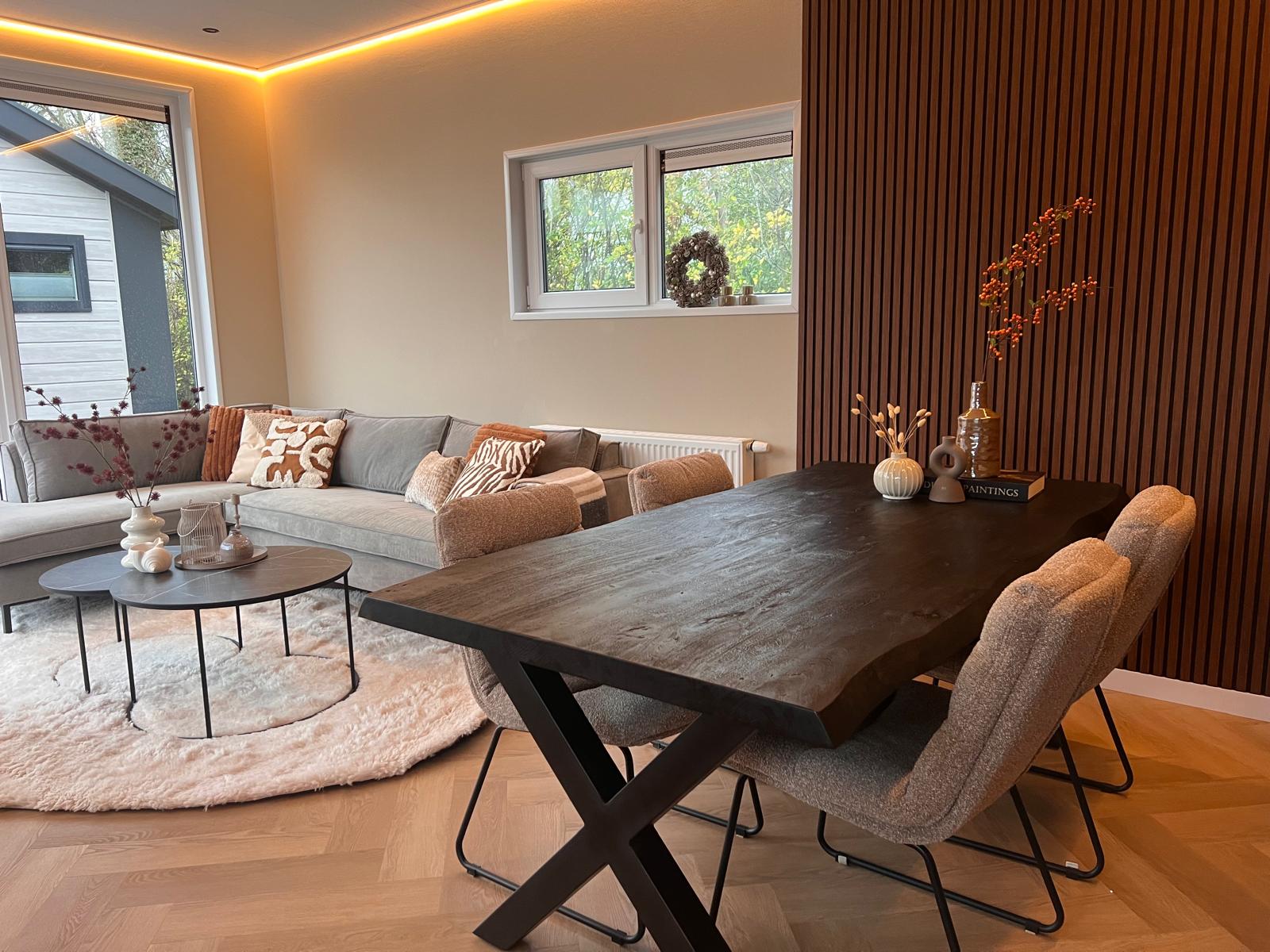 Met een royale afmeting geniet je binnen van veel licht en ruimte. De luxe keuken is voorzien van een ingebouwde oven, gaskookplaat, vaatwasser, afzuigkap en een natuurstenen werkblad – ideaal voor wie graag kookt in stijl. De woonkamer is uitgerust met een moderne elektrische haard, sfeervolle houten wandpanelen en indirecte verlichting wat warmte en gezelligheid brengt.