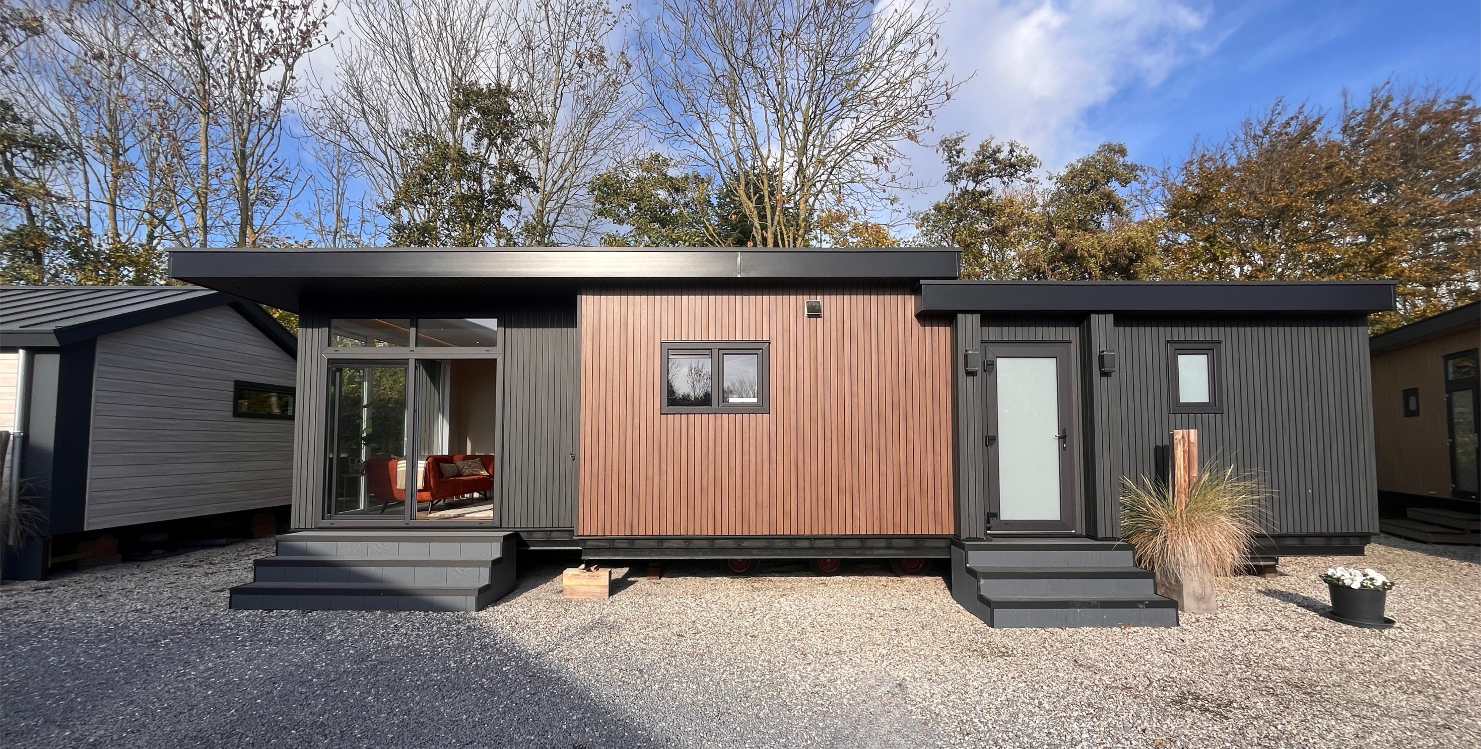 Een echte eyecatcher, dit chalet type Roggeplaat! De combinatie van  verticale zwarte en bruine bekleding geeft het chalet een stoere én stijlvolle uitstraling, waardoor het perfect past op elke locatie.