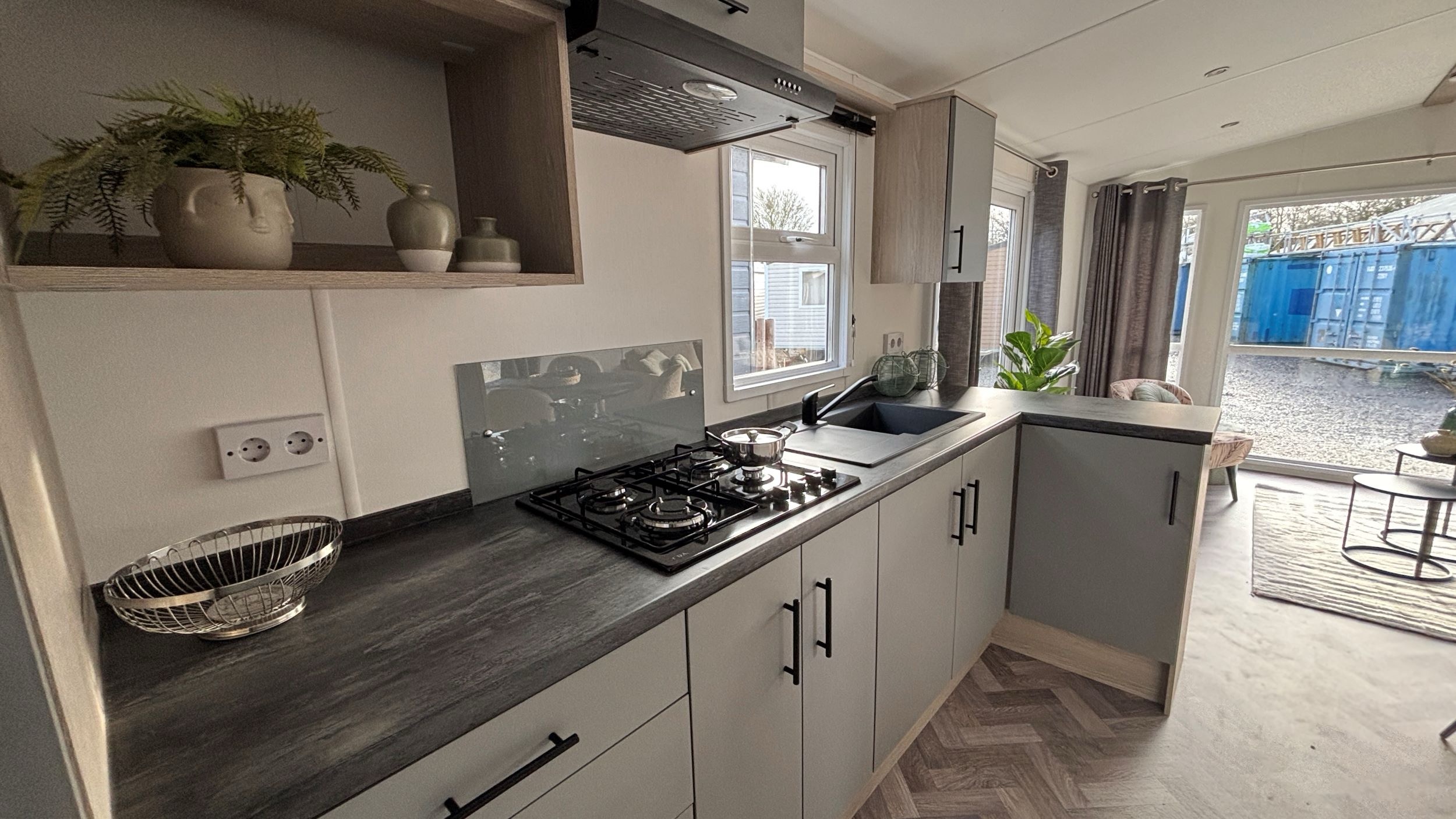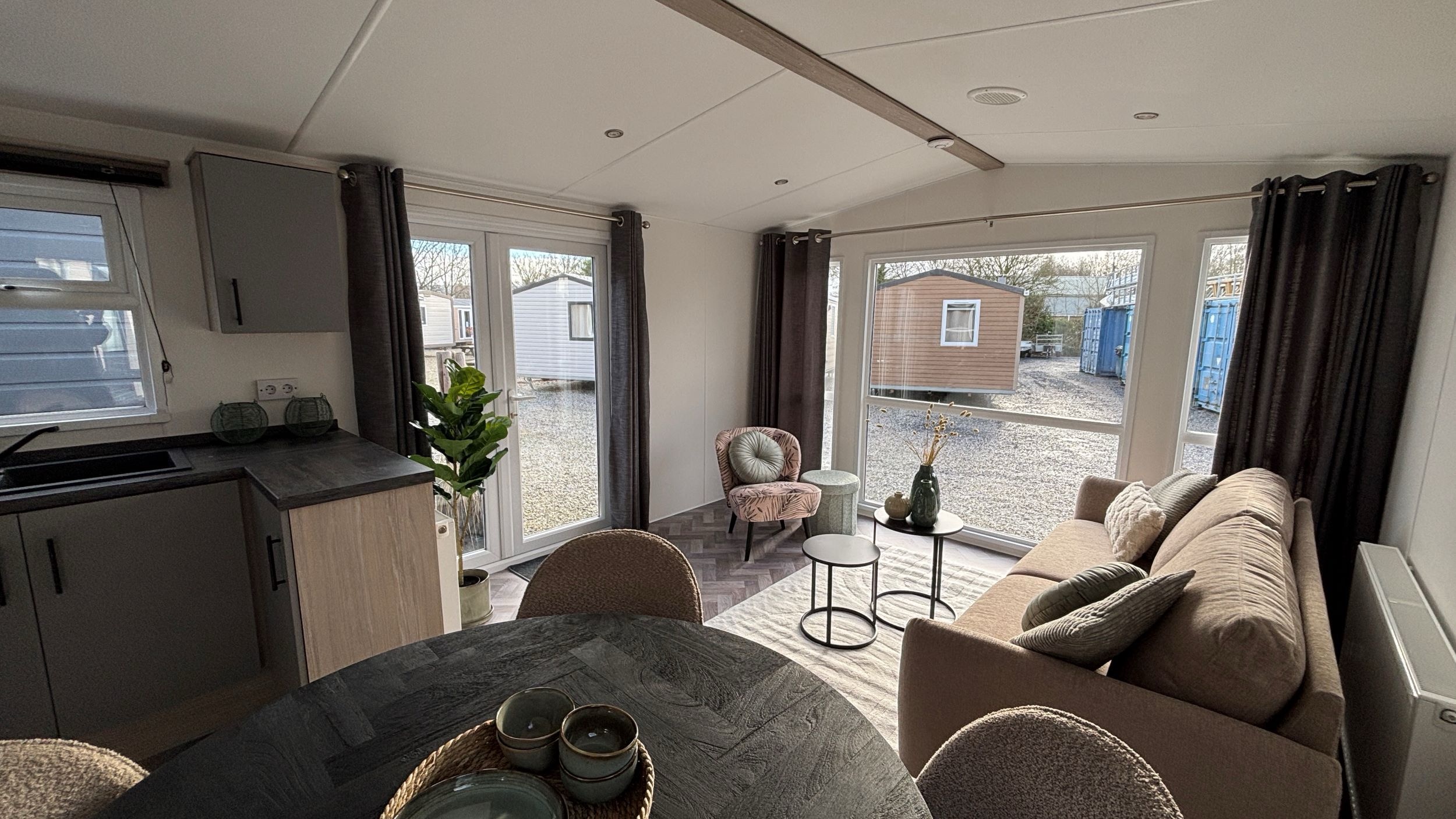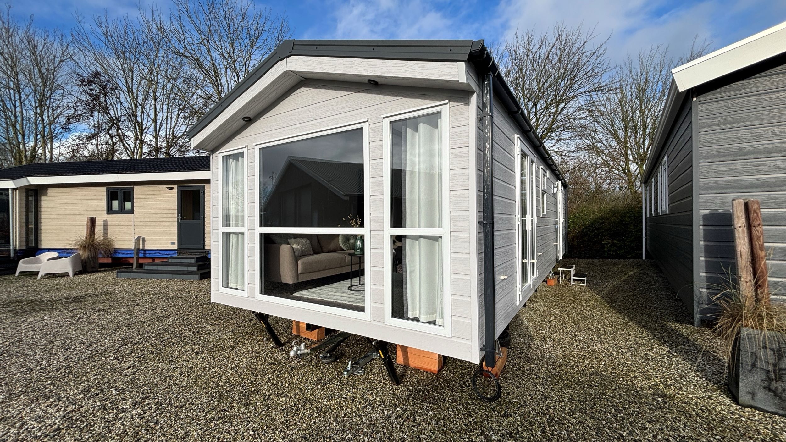 De indeling van dit chalet staat vast, er zijn twee slaapkamers met bedden, een badkamer en keuken maar ook een fijn woongedeelte. De kleuren en materialen van het interieur zijn op elkaar afgestemd. Licht en neutraal, dat past bij iedere woonstijl. De volgende stap is het plaatsen, aansluiten en tot slot de tuinaanleg. Een tuinhuis is niet bij de prijs inbegrepen maar kun je naar eigen wens (laten) plaatsen en het meubelpakket met decoratie is ter overname.