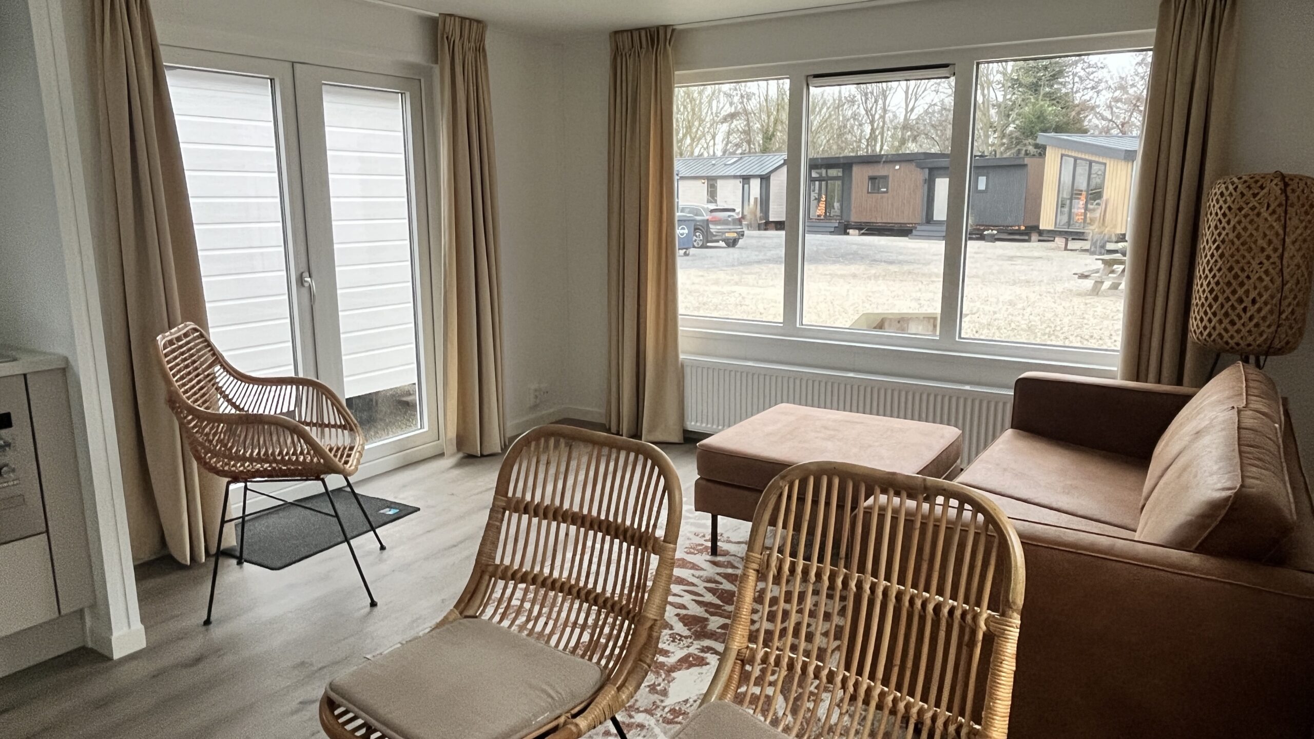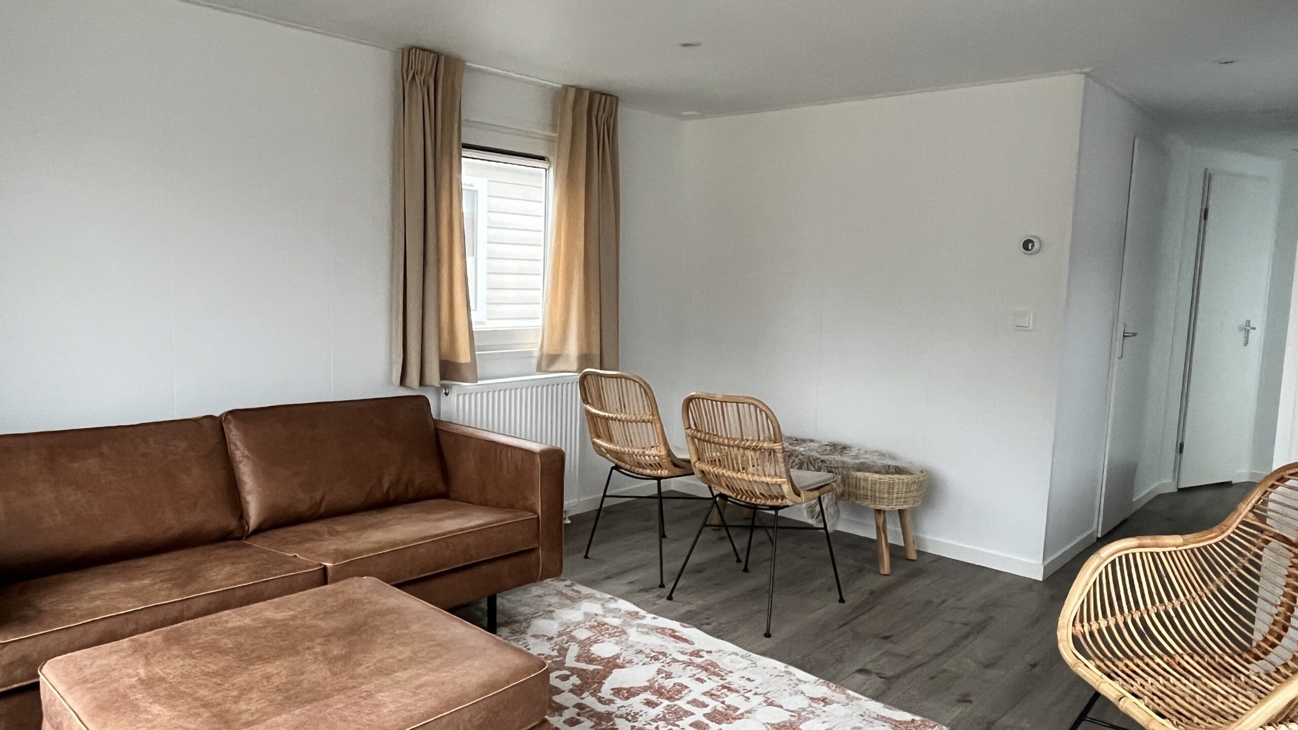 De lichte woonkamer biedt een aangename leefruimte met een draai-kiepraam en openslaande deuren die zorgen voor veel lichtinval en een directe verbinding met buiten.