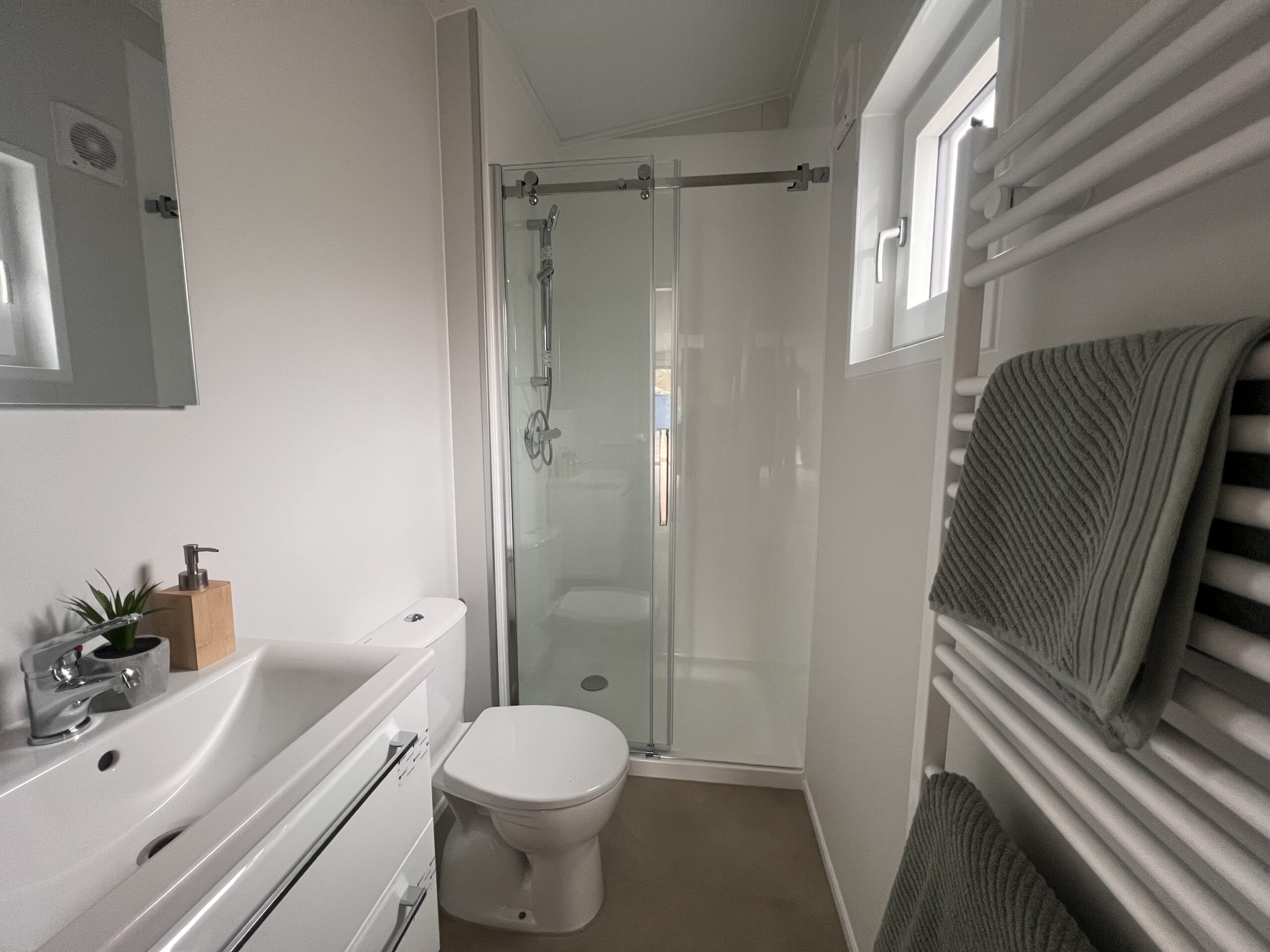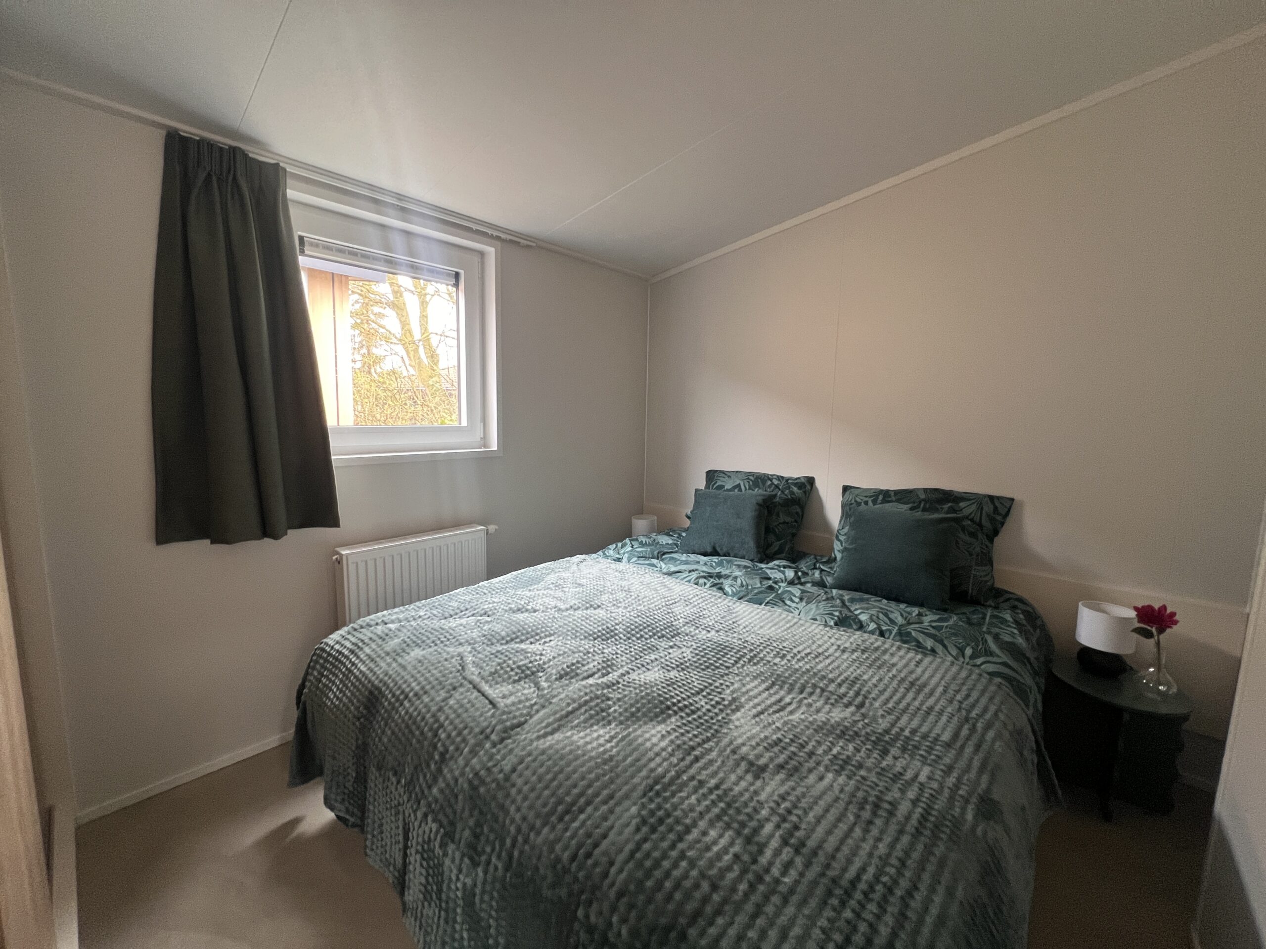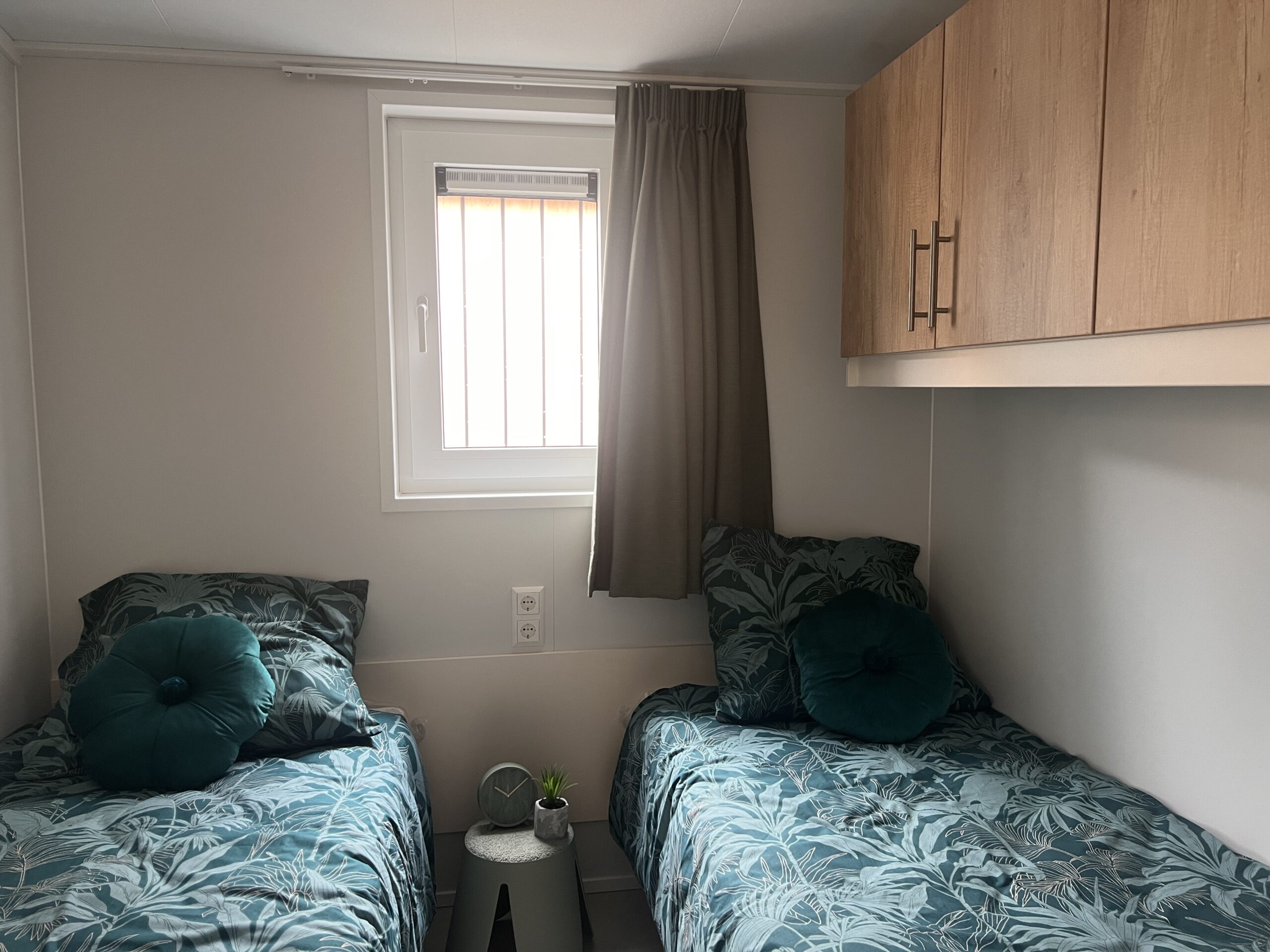 De masterbedroom beschikt over een grote schuifkast. De tweede slaapkamer is ingericht met twee eenpersoonsbedden. De strakke badkamer is voorzien van een douche met schuifdeur.