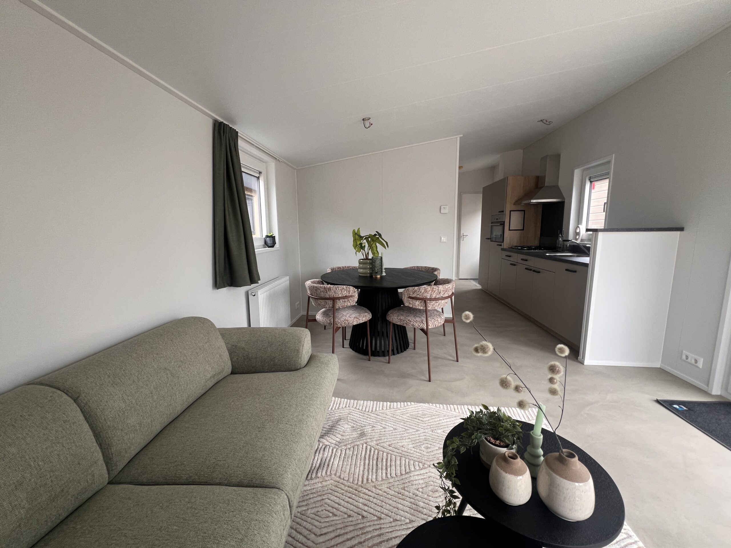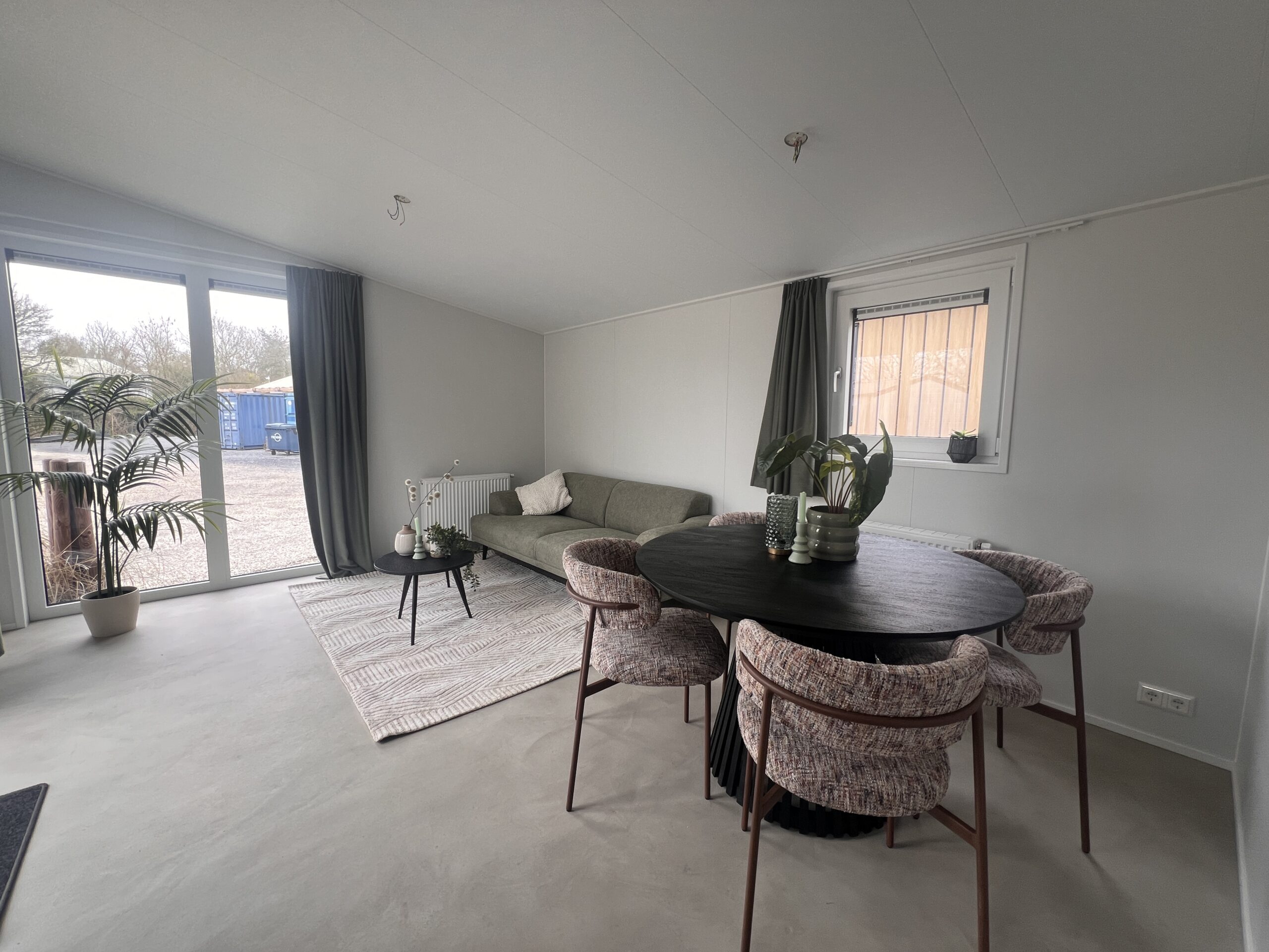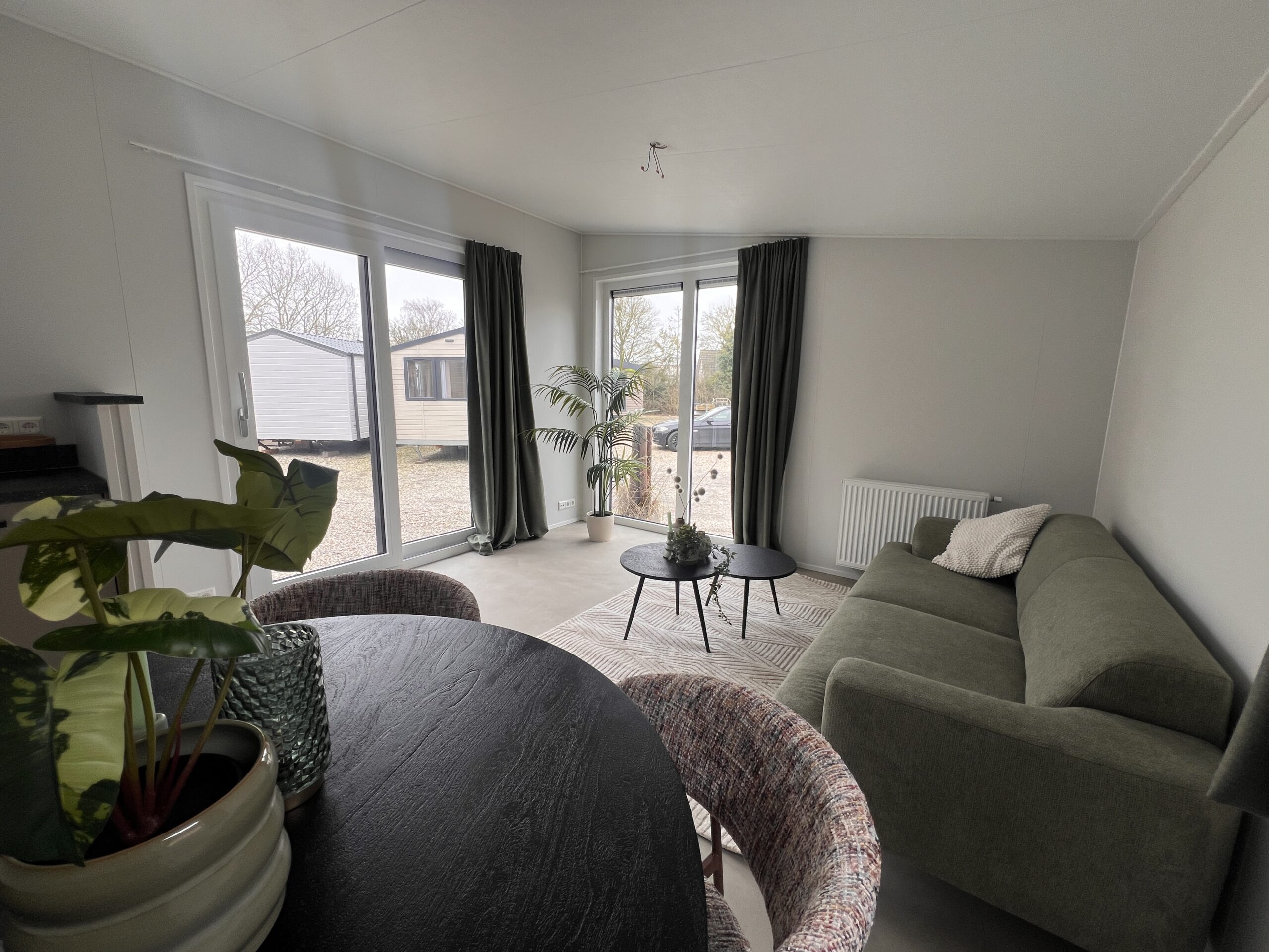 Daarnaast heeft het chalet twee grote raampartijen, waarvan één een schuifpui is die directe toegang biedt tot een eventueel terras.